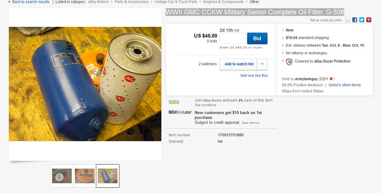 "WWII GMC CCKW Military Senior Complete Oil Filter, G-508"