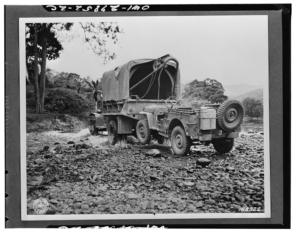 A one-and-a-half ton truck with wrecker mount pulling in a jeep during maneuvers somewhere in New Caledonia