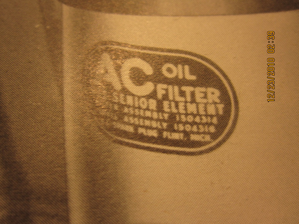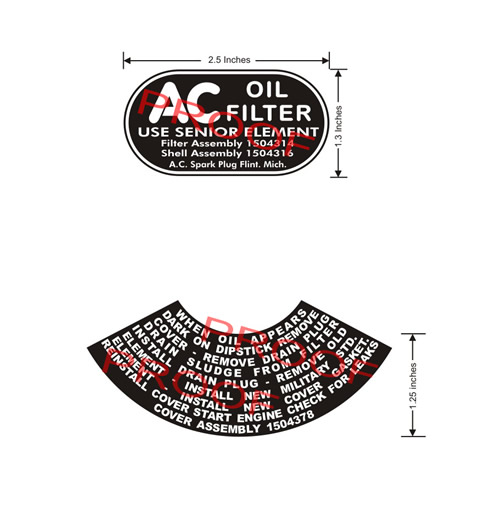 There actually appears to be an even EARLIER, early version. The very early CCKWs had dual oil filters, the decals on them are large squares. I do not have a very clear image of them, but they appear to be similar to later oil breather decal: A black line at the top and bottom, the AC logo the upper left and right corners, the copyright info along the bottom.