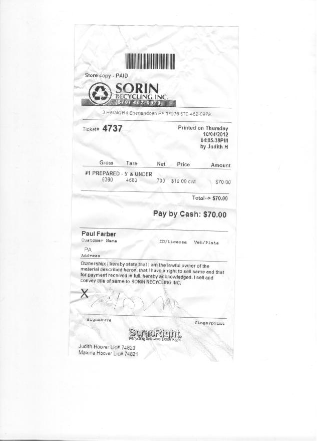 | 10/17/12 | Scrapped 880Lbs #1 Steel | +88.00 | -18.95 |