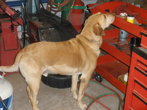 And this is Yeager. He doesn't give a crap about paint. There is a snausage on the top shelf of that cart.
