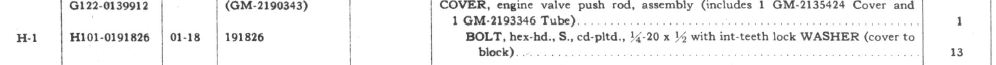 The last wartime SNL also lists the tapper cover bolts: "Bolt hex head, S. cd-pltd 1/4-20x1/2 with int teeth lock WASHER" PN 191826