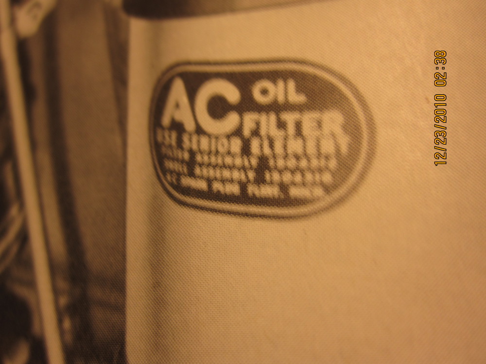 There actually appears to be an even EARLIER, early version. The very early CCKWs had dual oil filters, the decals on them are large squares. I do not have a very clear image of them, but they appear to be similar to later oil breather decal: A black line at the top and bottom, the AC logo the upper left and right corners, the copyright info along the bottom.