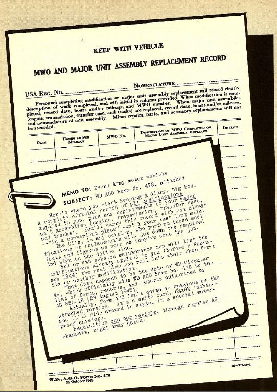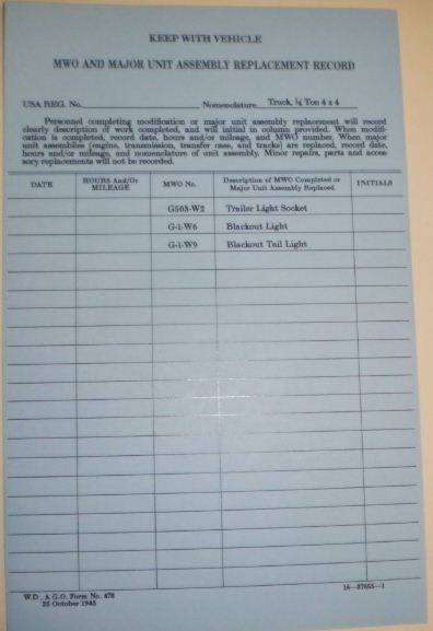 Here is a photo of an exact reproduction of the Form 478. It was originally from a Ford GPW: